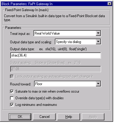 The Fixed-Point Blockset supports saturation and wrapping for all fixed-point data types, while guard bits are supported only for fractional data types. As shown below, you can select saturation or wrapping with the Saturate to max or min when overflows occur check box, and you can specify guard bits with the Output data type parameter.