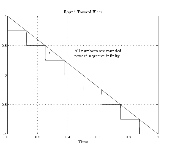 The Fixed-Point Blockset rounding modes are discussed below. The data is generated using Simulink's Signal Generator block and doubles are converted to signed 8-bit numbers with radix point-only scaling of \(2^{-2}\).
