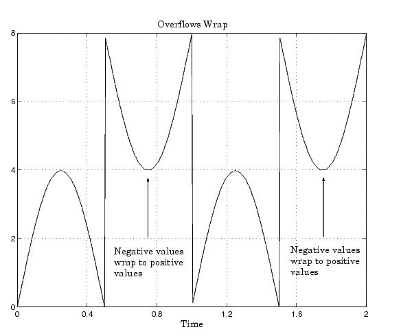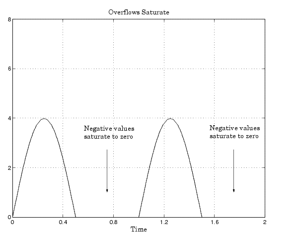 Consider an 8-bit unsigned word with radix point-only scaling of \(2^{-5}\). Suppose this data type must represent a sine wave that ranges from -4 to 4. For values between 0 and 4, the word can represent these numbers without regard to overflow. This is not the case with negative numbers. If overflows saturate, all negative values are set to zero, which is the smallest number representable by the data type.