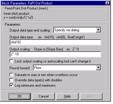 - Output scaling - Radix point-only or slope/bias scaling. These scaling modes are available only for generalized fixed-point data types.