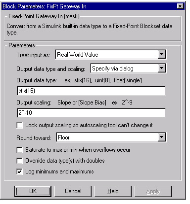 The FixPt Gateway In block is a masked S-function that converts a built-in Simulink data type to a Fixed-Point Blockset data type.