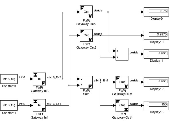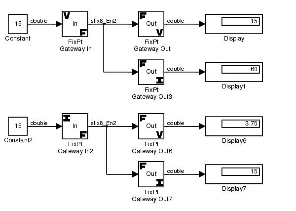 In the bottom model, the The FixPt Gateway In block treats the input as a stored integer, and the data type and scaling information is not applied. If the value is output from the FixPt Gateway Out block as a real-world value, then the scaling and data type information is applied to the stored integer, and the output value is 000011.11, or 3.75. If the value is output from the FixPt Gateway Out block as a stored integer, then you get back the original input value of 15.