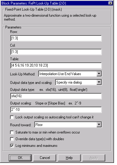 The FixPt Look-Up Table (2-D) block is a masked S-function that computes an approximation to some function z=f(x,y) given x, y, z data points. The look-up method can use interpolation, extrapolation, or the original values of the inputs. The x and y data vectors must be strictly monotonically increasing as described in the FixPt Look-Up Table reference pages.