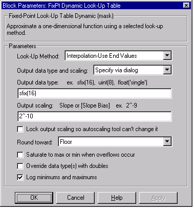 The FixPt Dynamic Look-Up Table block is a masked S-function that computes an approximation to some function y = f(x) given x, y data vectors. The look-up method can use interpolation, extrapolation, or the original values of the input.