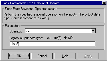 The FixPt Relational Operator block is a masked S-function that performs a comparison of its two inputs. The first (top) input is converted to the data type of the second (bottom) input prior to comparison.