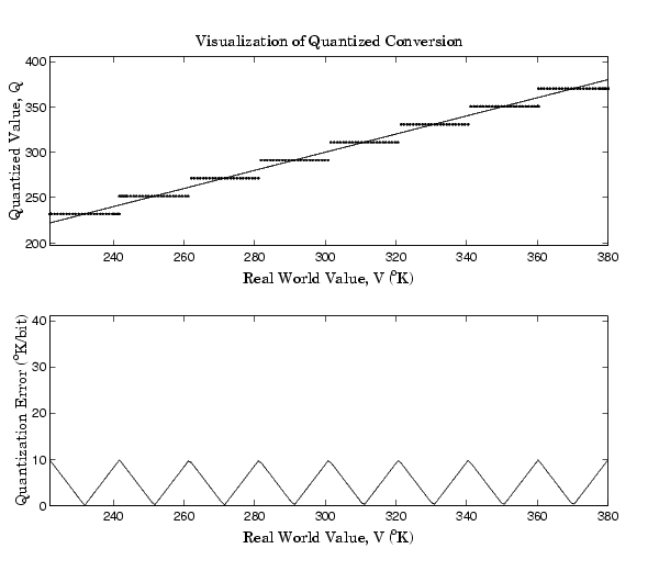 The air temperature needs to be quantized for processing by the embedded control system. Assuming an unrealistic quantization to 3-bit unsigned numbers: 0,1,2,...,7, the purely linear conversion with maximum precision is