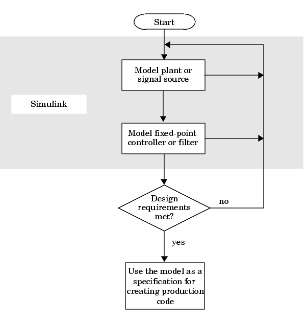 The Fixed-Point Blockset provides tools that aid in the development and testing of fixed-point dynamic systems. You directly design dynamic system models in Simulink, which are ready for implementation on fixed-point hardware. The development cycle is illustrated below.